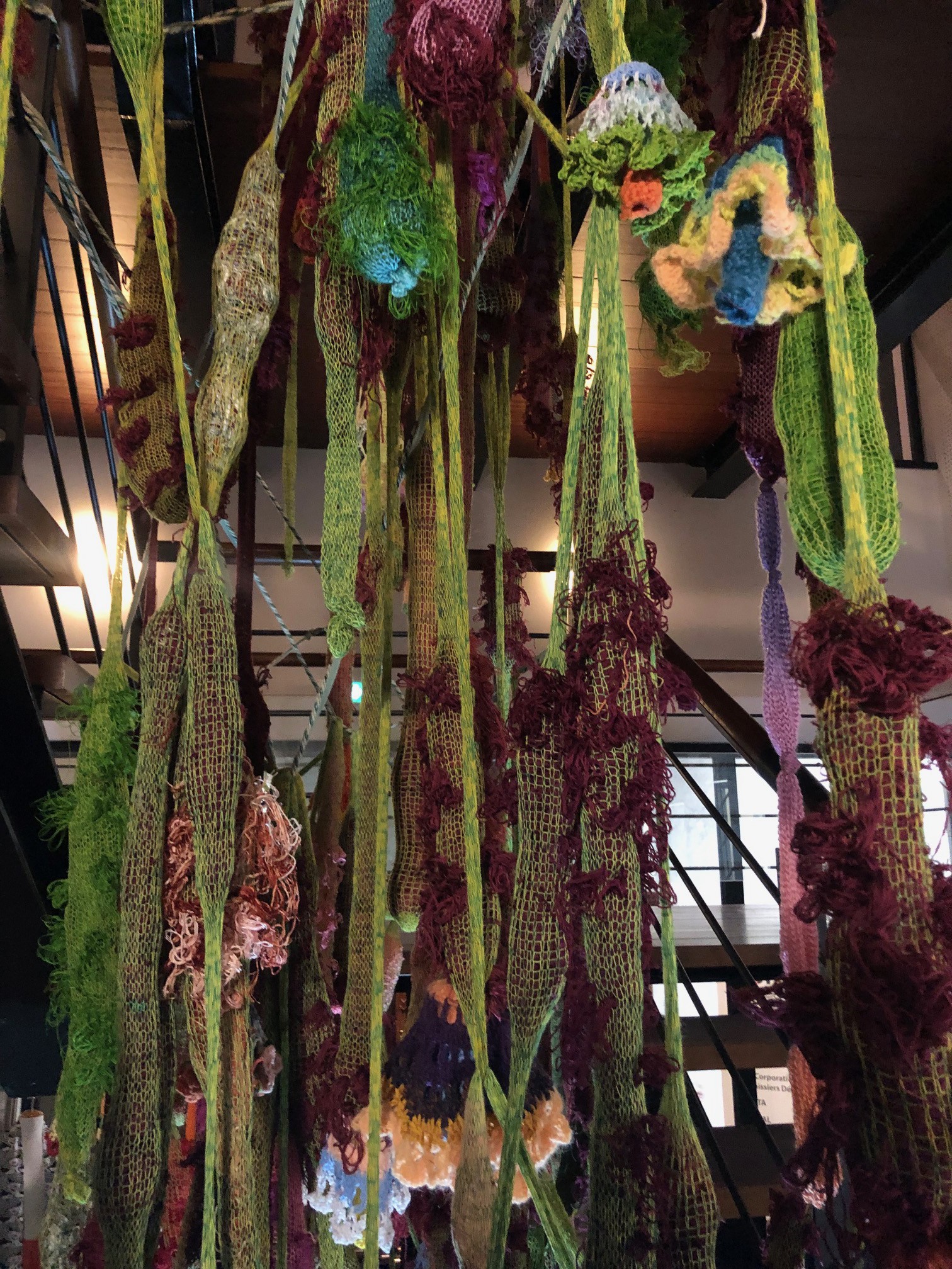 Aurélien Finance, artiste et diplômé de la HEAR, était présent durant le week-end pour expliquer ses créations. En effet, il s’intéresse à des techniques ancestrales de travail du fil, comme le tricot, le crochet ou la broderie. Il exprime son art à travers des lianes entremêlées en utilisant des fils de l’entreprise DMC de Mulhouse.